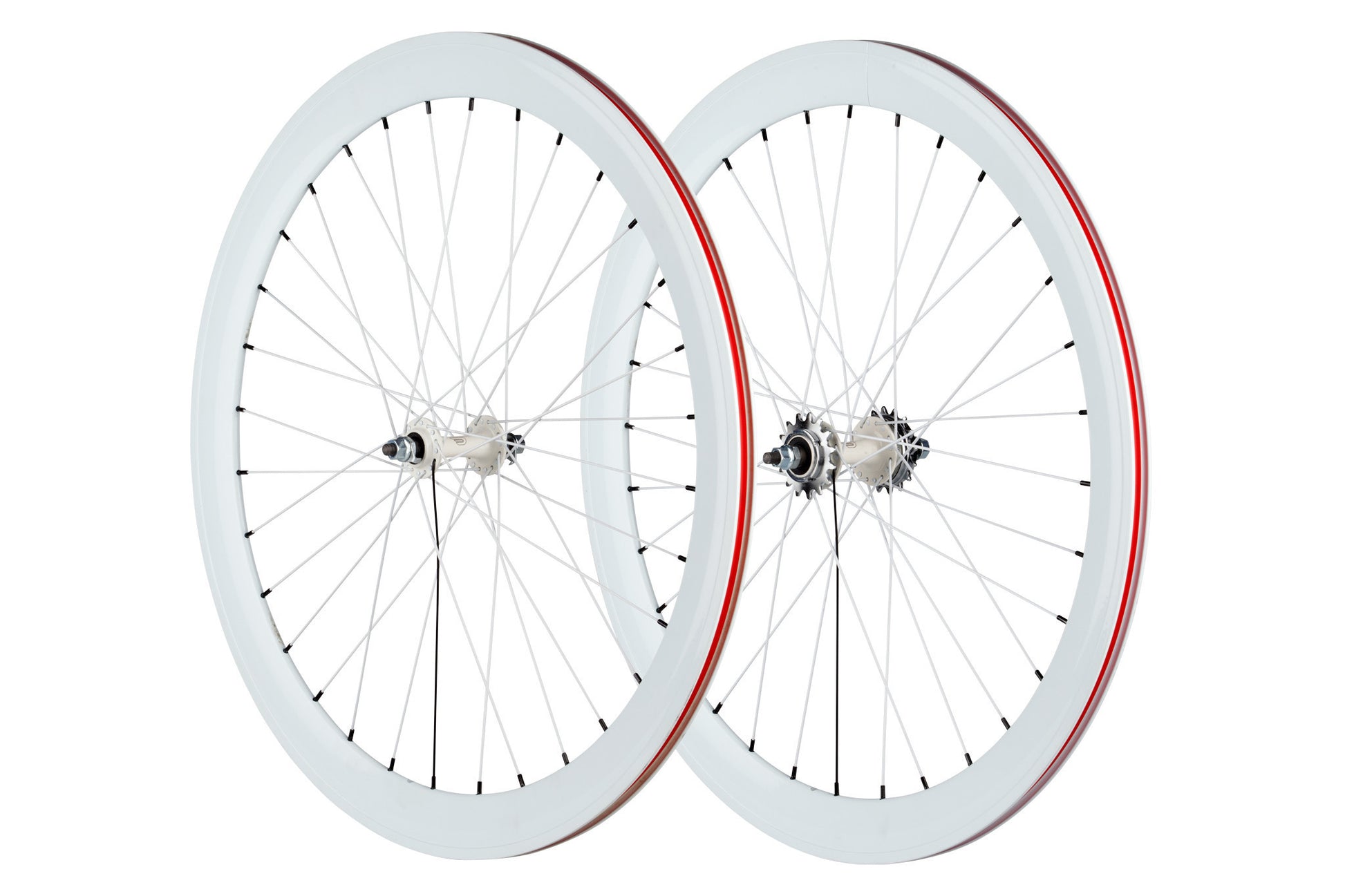 Pure Fix double-walled aluminum wheelsets are size 700C with a 40mm rim depth, front and rear. Our wheels include name-brand and laser-etched KT Quando hubs (100mm front, 120mm rear, 3/8" axle). Our rear wheels include flip-flop hubs with a pre-attached 16T fixed cog along with a 16T freewheel cog for single-speed riding. Our front and rear wheels are 32 spokes each. All wheelsets include nylon rim-strips to protect against sharp edges and prevent tube puncture.